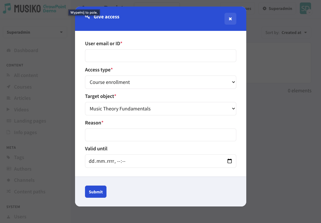 This documentation explains how to navigate the Access Registry, interpret access records, manually grant or revoke course access, and troubleshoot common enrollment concerns. By using the Access Registry effectively, administrators can maintain consistent access control, ensure users receive the correct course permissions, and uphold a smooth learning experience across the platform.