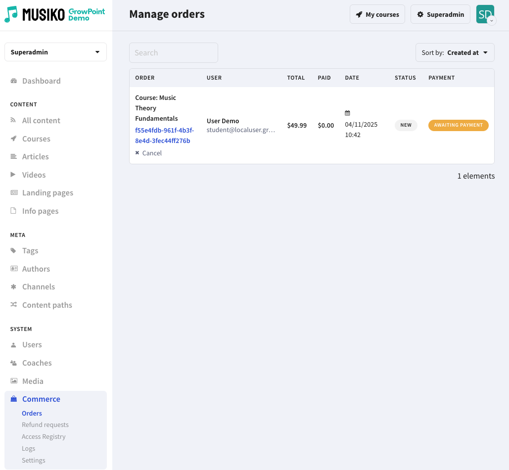 This documentation explains how to navigate the Orders interface, search and filter transactions, view individual order details, process refunds, and manage enrollment rights associated with each purchase. With these tools, platform administrators can efficiently maintain order accuracy, resolve customer inquiries, and ensure a seamless purchasing experience for learners.
