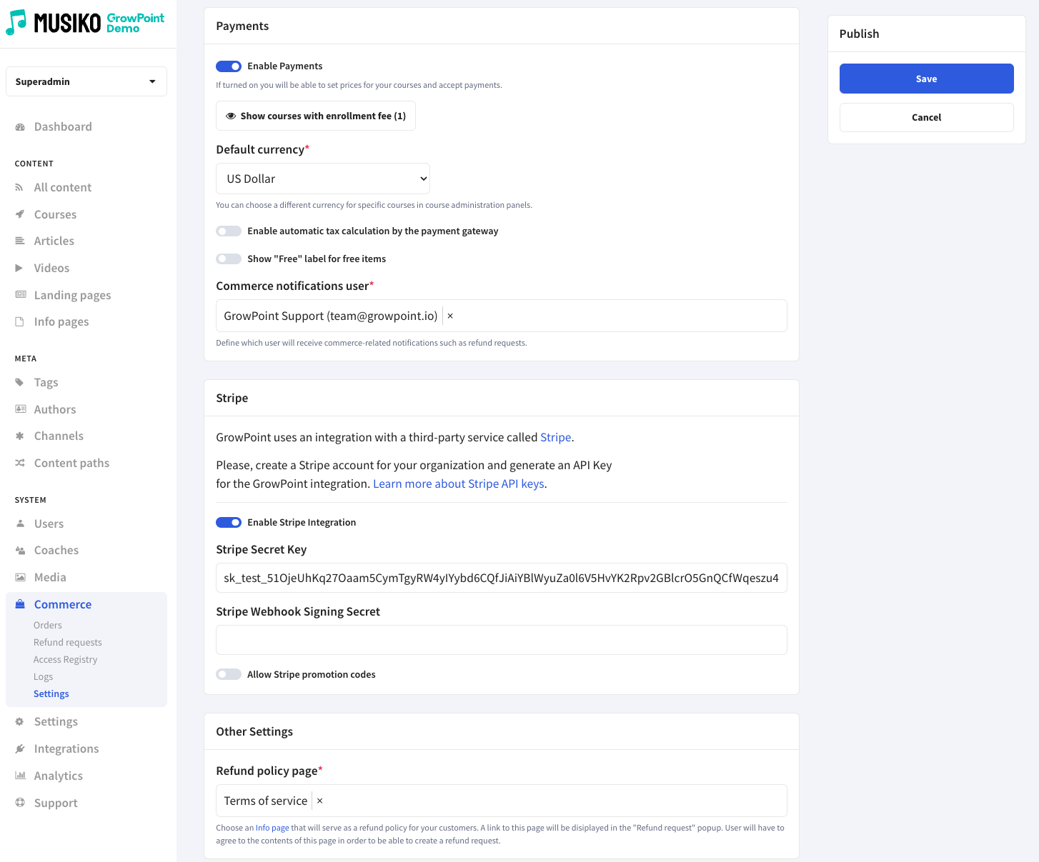 The Settings module allows administrators to configure all commerce-related parameters for paid courses, ensuring the platform operates according to organizational policies and business requirements. This section centralizes essential configuration options that affect pricing, payments, refunds, access rules, notifications, and overall system behavior.