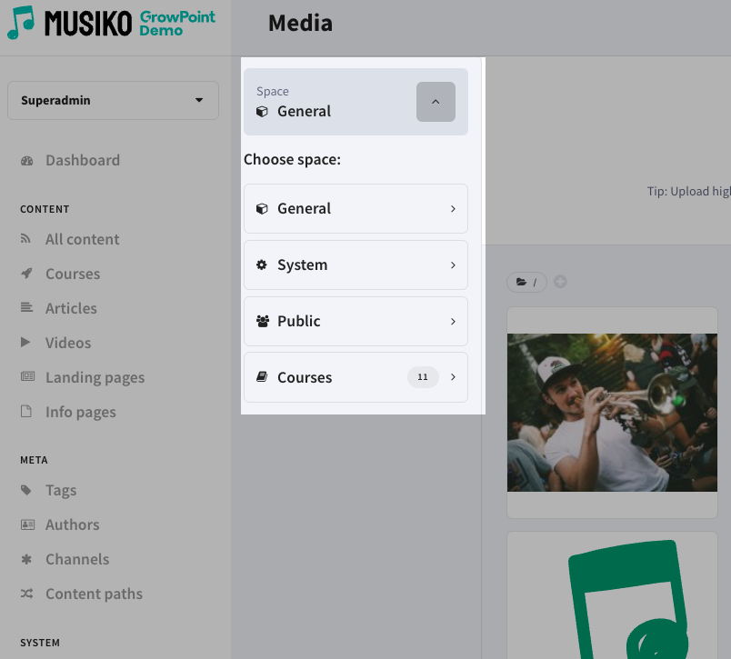 The „Courses” collection is a group of spaces that are course-specific. Every course has its own space and the Course Administrator has access to it. When managing course content this space will be chosen by default (e.g., when adding an image).