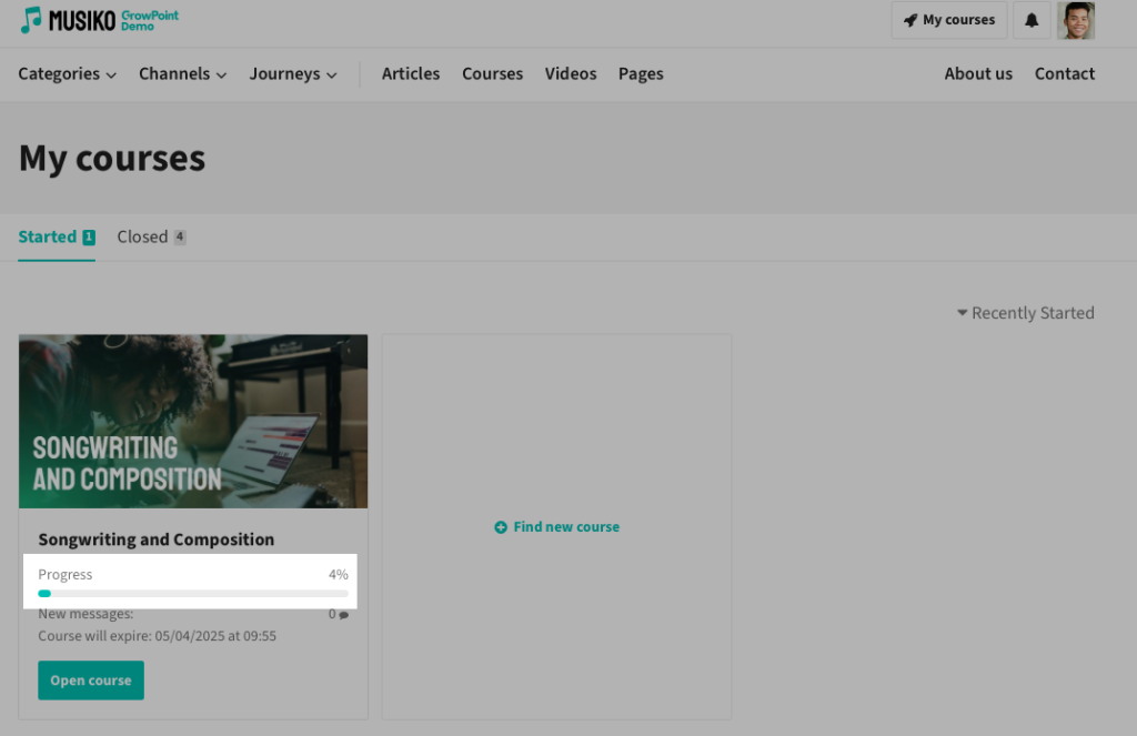 The My Courses panel is your personal hub that lists all courses in which you are involved. You can view both active (ongoing) and closed (completed) courses.